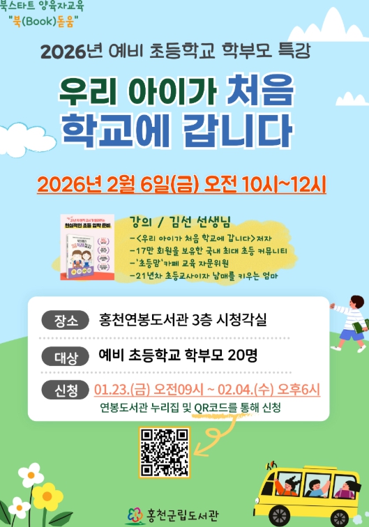 이번 교육은 2026년 예비 초등학교 학부모 특강 “우리 아이가 처음 학교에 갑니다”를 주제로, 2월 6일 오전 10시 연봉도서관에서 진행된다.