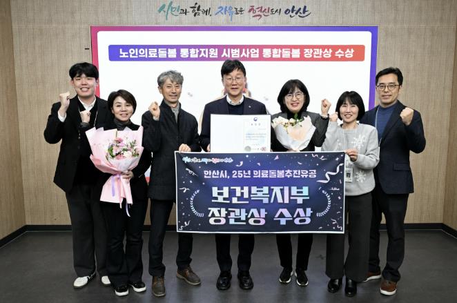 | ▲ 이민근 안산시장(가운데)이 '2025년 누구나 돌봄사업' 경기도 평가에서 최우수상을 수상하고 관련 공직지들과 함께 기념촬영을 하고 있 |