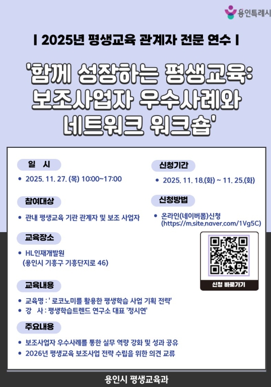[뉴스앤톡] 용인특례시는 11월 18일부터 25일까지 네이버폼을 통해 평생교육 관계자 전문 연수인 ‘함께 성장하는 평생교육: 보조사업자 우수사례와 네트워크 워크숍’ 참가자를 모집한다고 16일 밝혔다.