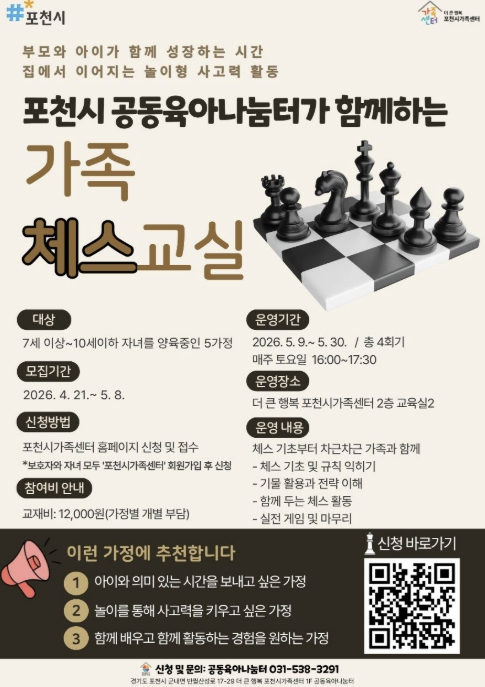 [뉴스앤톡] 포천시 더 큰 행복 포천시가족센터는 공동육아나눔터 상시 프로그램의 일환으로 아동의 논리적 사고력 향상과 부모-자녀 간 긍정적 상호작용을 지원하기 위해 가족 참여형 체스 프로그램 '가족 체스 교실'을 운영한다고 밝혔다.