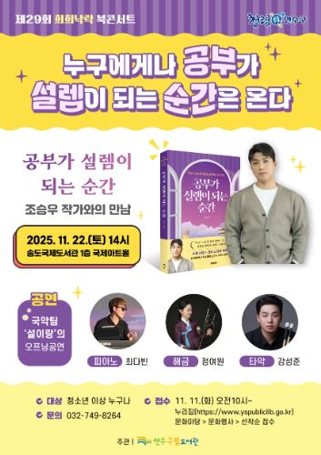이번 행사는 국악팀 ‘설이랑’의 퓨전 국악 공연을 시작으로 ‘공부가 설렘이 되는 순간’의 저자 조승우 작가를 초청해 ‘공부라는 벽을 넘어서는 마음의 힘’을 주제로 용기와 성장의 메시지를 전할 예정이다.