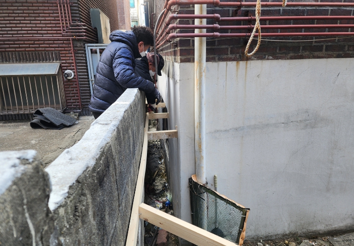 집수리 봉사활동에는 전국인테리어목수 사회적협동조합 소속의 전문 기술을 보유한 봉사단체가 참여해 노후 담벼락의 상태를 점검하고, 임시로 구조 보강을 위한 버팀목을 설치해 안전성을 높였다.