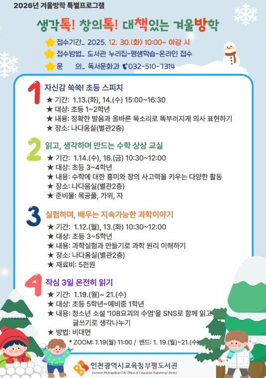 프로그램 신청은 12월 30일 오전 10시부터 부평도서관 누리집에서가능하며, 교육은 부평도서관과 부광초등학교, 십정초등학교에서 진행된다.