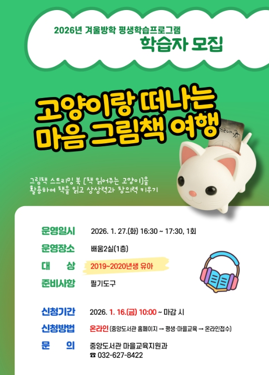 2019~2020년생 유아를 대상으로 하는 '고양이랑 떠나는 마음 그림책 여행'과 초등학교 1~3학년을 대상으로 하는 '새해 복(福) 담은 3D펜 열쇠고리 만들기' 프로그램으로 운영된다.
