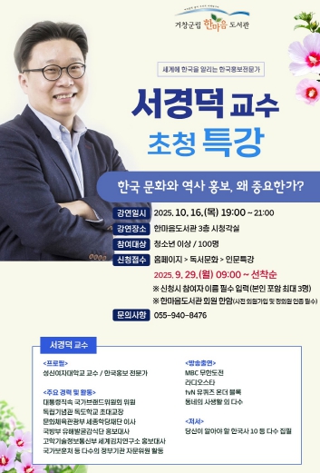 [뉴스앤톡] 거창군은 한마음도서관에서 10월 16일 저녁 7시 한국을 세계에 널리 알리는 대표 홍보전문가 서경덕 교수 초청 특강을 개최한다.