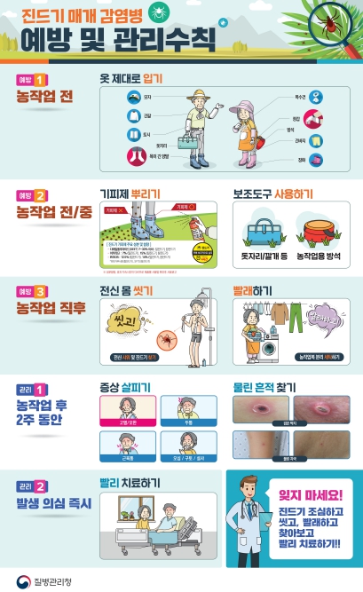 진드기 매개 감염병 예방을 위한 효과적인 방법은 진드기에 물리지 않는 것이다. 야외활동·농작업 시▲긴팔, 긴바지, 양말, 모자, 장갑 착용 등▲3~4시간마다 진드기 기피제 사용 ▲귀가 후 세탁 및 샤워하기 ▲증상 시 의료기관 진료 등의 수칙을 준수하는 것이 중요하다.