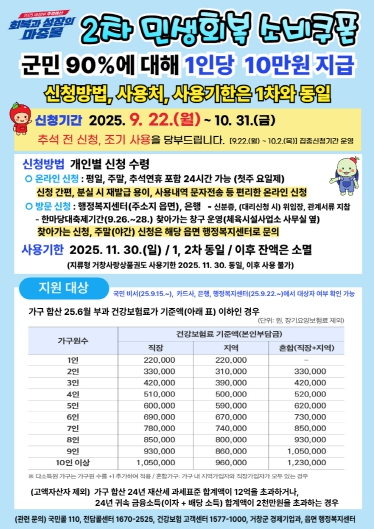 군은 9월 22일부터 10월 2일까지 집중 신청기간을 운영하며, 군민들에게 추석 전 신청과 조기 사용을 당부했다. 이번 2차 신청은 첫 주에 한해 온라인 신청만 요일제가 적용되며, 읍·면 행정복지센터를 통한 방문 신청은 요일제 상관없이 가능하다. 다만, 초기 혼잡을 줄이기 위해 분산 방문을 권장했다.