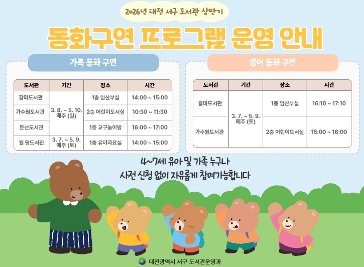 다음 달 7일부터 5월 10일까지 운영되며, 가족 동화구연은 4개 도서관에서 관별 10회씩, 영어 동화구연은 갈마ㆍ가수원도서관에서 각각 10회씩 진행된다.