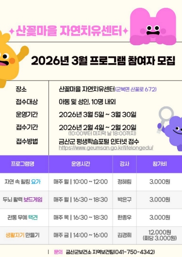 [뉴스앤톡] 금산군은 지역 주민의 건강 증진과 여가 활성화를 위해 2월 20일까지 산꽃마을 자연치유센터 2026년 3월 프로그램 참여자를 프로그램별로 8명에서 12명까지 총 40여 명 규모로 모집한다.