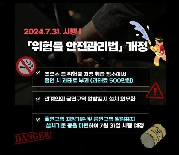 [뉴스앤톡] 여수소방서는 2024년 7월 31일부터 시행된 '위험물안전관리법' 제19조의 2(제조소 등에서의 흡연 금지) 신설에 따른 주유소, 위험물 저장소, 취급소 등 ‘제조소등’에서의 화재 ·폭발로부터 시민 안전 확보를 위한 흡연금지 규정의 적극적인 홍보에 나섰다.