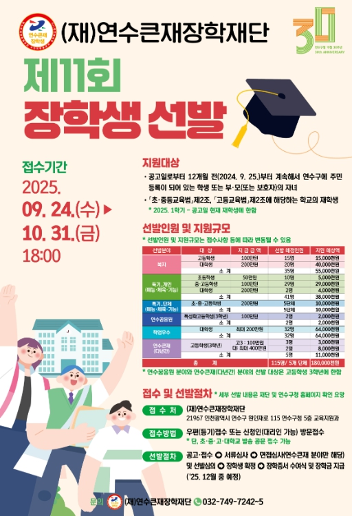 [뉴스앤톡] (재)연수큰재장학재단은 미래 지역사회를 이끌어 갈 우수 인재 발굴과 양성을 위해 제11회 장학생을 선발한다.