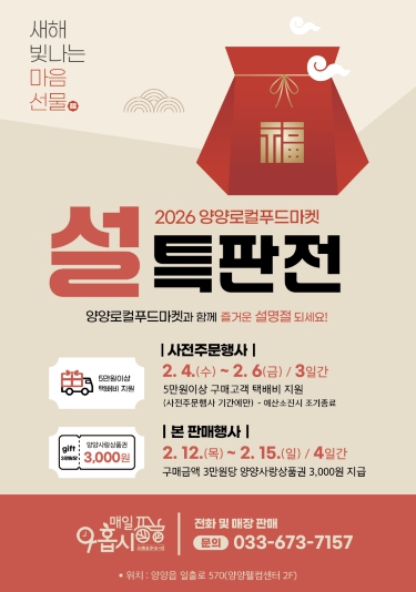 [뉴스앤톡] 개장 이후 누적 매출 7억 8천만 원을 돌파하며 지역 농산물 유통의 성공 모델로 자리 잡은 양양군 로컬푸드마켓 ‘매일아홉시’가 설 명절을 맞아 설맞이 특별판매전을 개최한다.