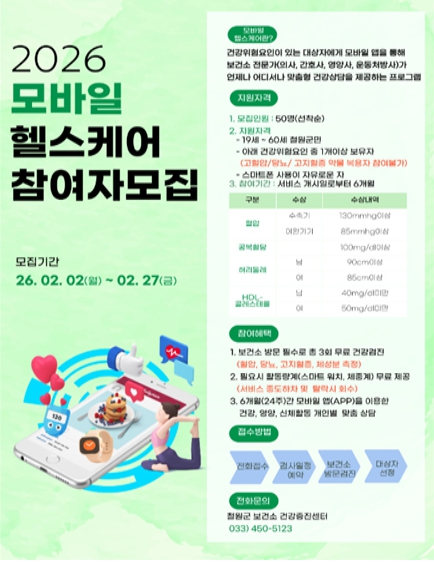 [뉴스앤톡] 철원군보건소는 군민의 건강증진과 만성질환 예방을 위해 스마트폰 앱을 활용한 맞춤형 건강관리 서비스인 ‘모바일 헬스케어 사업’ 참여자 50명을 선착순으로 모집한다.