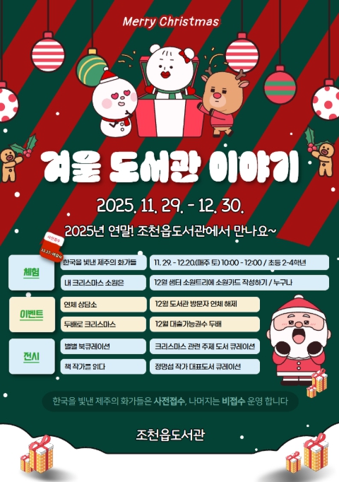 [뉴스앤톡] 제주시 조천읍도서관은 지역 주민에게 따뜻한 겨울의 추억을 선사하기 위해 11월 29일부터 12월 30일까지 송년 특별 프로그램 ‘겨울 도서관 이야기’를 운영한다.
