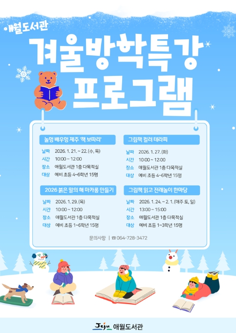 [뉴스앤톡] 제주시 애월도서관은 겨울방학을 맞아 어린이들이 책과 놀이, 체험 활동을 통해 즐겁게 배우고 독서에 대한 흥미와 창의력을 키울 수 있도록 ‘2026 애월도서관 겨울방학특강 프로그램’을 운영한다.