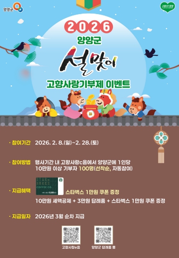 이번 이벤트는 2026년 2월 8일부터 2월 28일까지 진행되며, 행사 기간 중 고향사랑e음 홈페이지를 통해 양양군에 10만 원 이상 기부하고 답례품을 선택한 기부자 가운데 선착순 100명에게 스타벅스 모바일 쿠폰(1만 원권)을 제공한다.