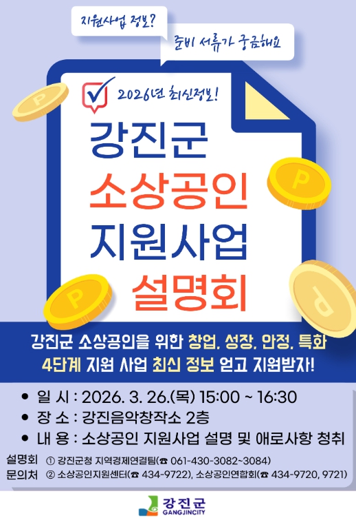 [뉴스앤톡] 강진군이 오는 26일 강진군 음악창작소 2층에서 현장에서 바로 활용할 수 있는 실질적인 지원정보를 제공하고 소상공인의 애로사항을 직접 청취하기 위한 ‘2026년 소상공인 지원사업 설명회’를 개최한다.