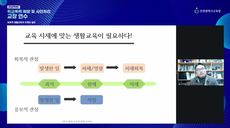 이어 이재영 회복적정의교육원장을 초빙해 ‘회복적 생활교육의 철학과 현장 적용 사례’를 중심으로, 학교 내 갈등 상황에서 관리자가 갖춰야 할 역할과 구체적인 대응 방안을 공유했다.