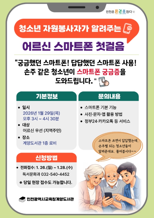 [뉴스앤톡] 인천광역시교육청계양도서관은 오는 29일 1층 로비에서 ‘어르신 스마트폰 첫걸음’행사를 운영한다.
