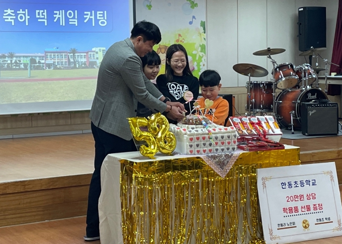 지난해 한동초 4학년 학생들이 당근 농사 수확금(6만 8000원)을 마을 경로당에 기부한 것에 대한 보답으로 한동리 경로당(회장 허대우)에서 학생들을 위한 학용품 선물(20만원 상당)을 전달하며 훈훈한 감동을 전했다.
