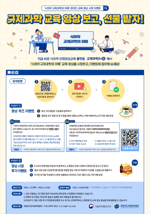 이번 이벤트는 ‘규제과학IN(人)’에서 ‘식의약 규제과학의 이해’ 영상을 시청한 후 퀴즈를 풀거나 인증 사진과 함께 시청 후기를 작성하면 된다. 참가자 중 추첨을 통해 소정의 선물이 제공된다.
