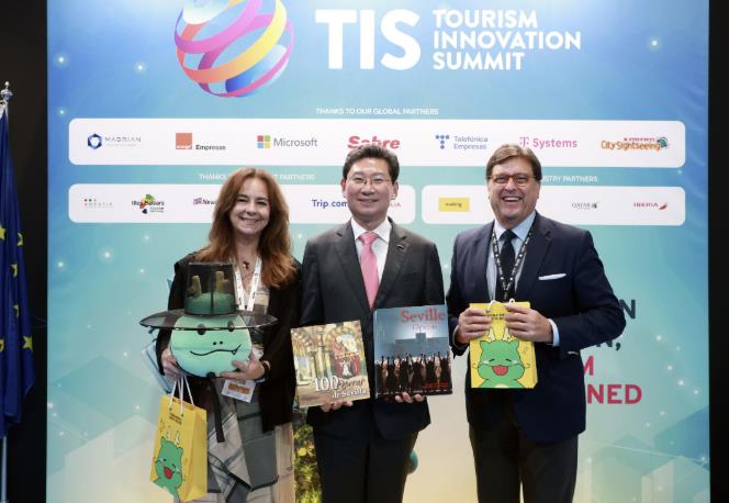 | ▲ 스페인 세비야 피베스(FEBIS)에서 이상일 시장(가운데)과 안토니오 카스타뇨 세비야시 관광청장(오른쪽)이 기념품 전달 후 기념 사진을 촬영하고 있다 |