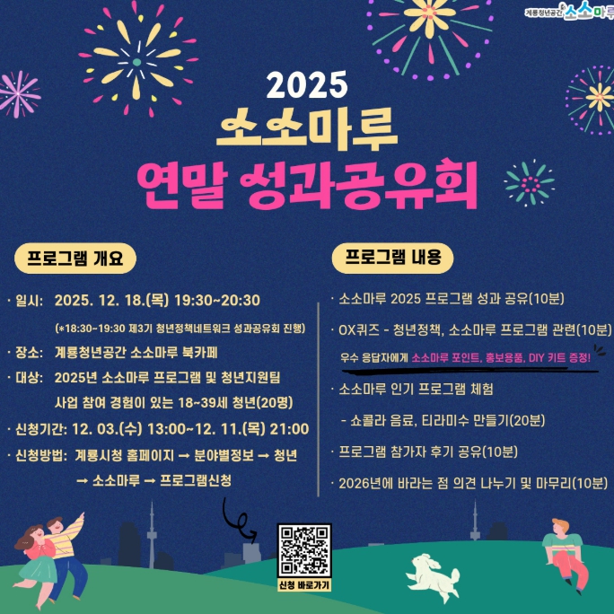 계룡시 관계자는 “청년들이 올 한 해 활동을 돌아보고 서로를 격려하는 뜻깊은 자리가 될 것”이라며 “앞으로도 청년들의 의견을 반영한 소통 중심 공간으로 소소마루를 운영해 나가겠다”고 말했다.