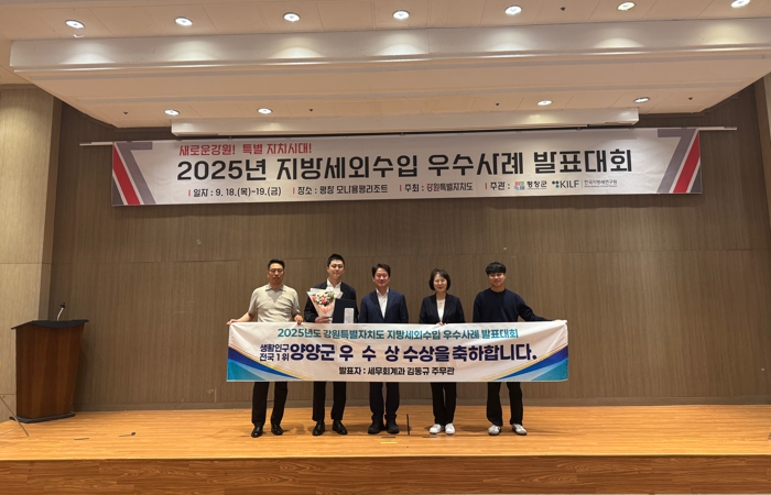 [뉴스앤톡] 양양군은 지난 9월 19일 강원도 평창 모나 용평리조트에서 열린 ‘2025 지방세외수입 우수사례 발표대회’에서 신규수입원발굴 부문 우수상을 수상했다.