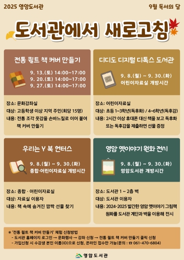 영암도서관의 9월 새로고침 프로그램에 대한 안내는 061-470-6804에서 한다.