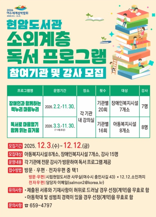 [뉴스앤톡] 여수시립현암도서관은 오는 12월 3일부터 12일까지 소외계층 독서 프로그램 참여 기관을 공개 모집한다.