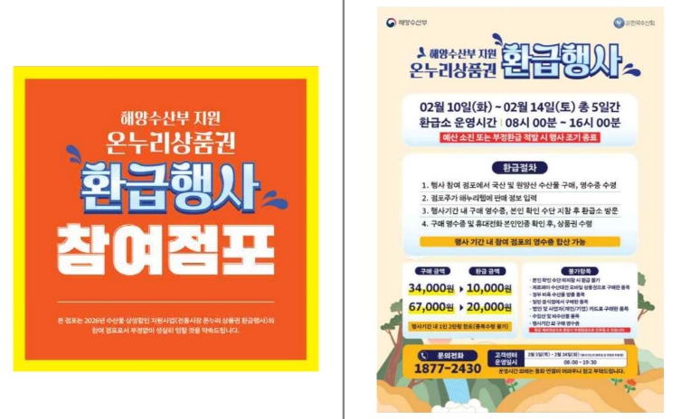 환급 기준은 구매 금액에 따라 ▲3만4,000원 이상 6만7,000원 미만 구매 시 1만 원 ▲6만7,000원 이상 구매 시 2만 원이다. 환급 대상은 국내산 및 원양산 수산물 구매 금액에 한하며, 횟집 등 음식점에서 사용한 금액은 환급 대상에서 제외된다.