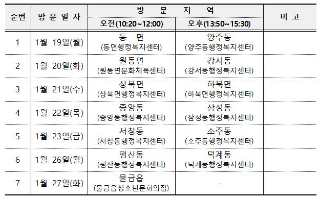 읍·면·동별 일정은 19일 동면(오전)·양주동(오후)을 시작으로, 20일 원동면(오전)·강서동(오후), 21일 상북면(오전)·하북면(오후), 22일 중앙동(오전)·삼성동(오후), 23일 서창동(오전)·소주동(오후), 26일 평산동(오전)·덕계동(오후)을 거쳐, 27일 물금읍(오전)에서 마무리될 예정이다.