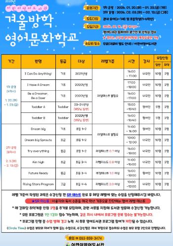1차는 오는 20일부터 23일까지 3~7세 대상 강좌 5개, 2차는 2월 3일부터 13일까지 초등학생 1~6학년을 대상으로 6개 강좌가 운영된다.