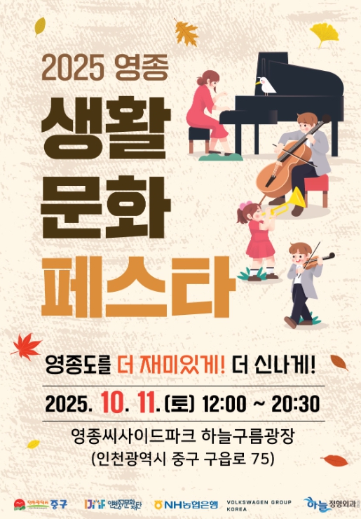 [뉴스앤톡] (재)인천중구문화재단은 오는 10월 11일 영종씨사이드파크 하늘구름광장(인천 중구 구읍로 75)에서 ‘2025 영종 생활문화 페스타’를 개최한다고 밝혔다.