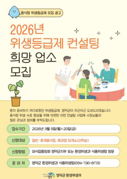 [뉴스앤톡] 영덕군은 지역 음식점의 위생 수준을 높이고 외식 환경의 경쟁력을 강화하기 위해 올해 ‘음식점 위생 등급제 컨설팅’ 사업에 참여 업소를 오는 9일부터 20일까지 선착순으로 모집한다.