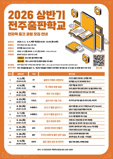 올해 전주출판학교는 상반기 전자책 출간 과정과 하반기 독립출판 출간 과정으로 운영될 예정으로, 참여자들은 기획부터 집필·편집·디자인·인쇄·유통까지 출판 전 과정을 배울 수 있다.