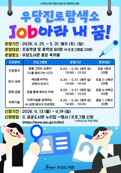 [뉴스앤톡] 제주시 우당도서관은 어린이와 청소년이 다양한 직업 세계를 경험하며 미래를 설계할 수 있도록 돕기 위해 오는 4월 25일부터 5월 31일까지 ‘우당진로탐색소: Job아라 내 꿈!’ 프로그램을 운영한다.