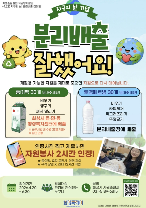 [뉴스앤톡] 화성특례시가 2026년 ‘지구의 날(4월 22일)’을 맞아 시민들이 일상 속에서 환경 보호를 실천할 수 있는 자원봉사 활동 '분리배출 잘했어요' 캠페인을 운영한다고 밝혔다.