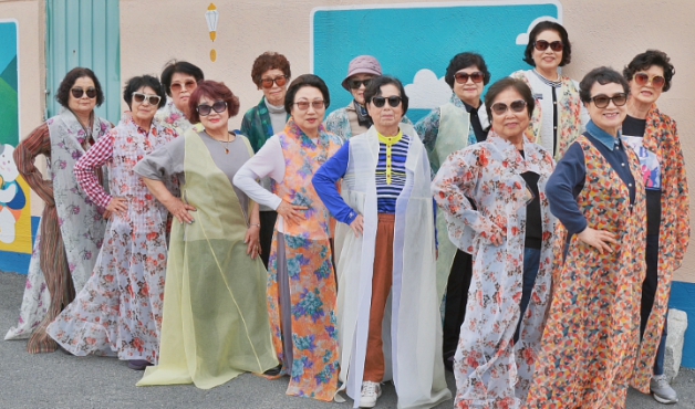 | ▲ 경주시 황오동 ‘황촌 살롱’ 프로그램에 참여한 어르신들이 시니어 모델 체험 활동에 참여하며 포즈를 취하고 있다. |