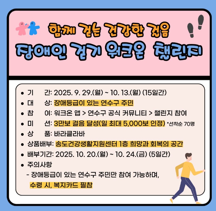 [뉴스앤톡] 연수구가 지역 장애인의 건강 증진과 자가 건강관리 능력 강화를 위해 ‘함께 걷는 건강한 걸음, 장애인 걷기 워크온 챌린지’를 운영한다.