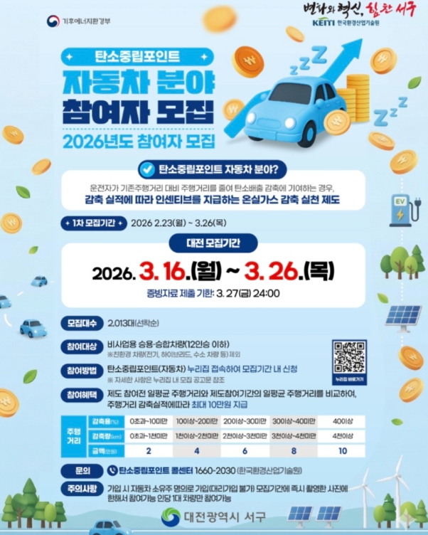 [뉴스앤톡] 대전 서구는 온실가스 감축을 위해 3월 16일부터 26일까지 2026년 자동차 탄소중립포인트제 참여자를 모집한다고 13일 밝혔다.