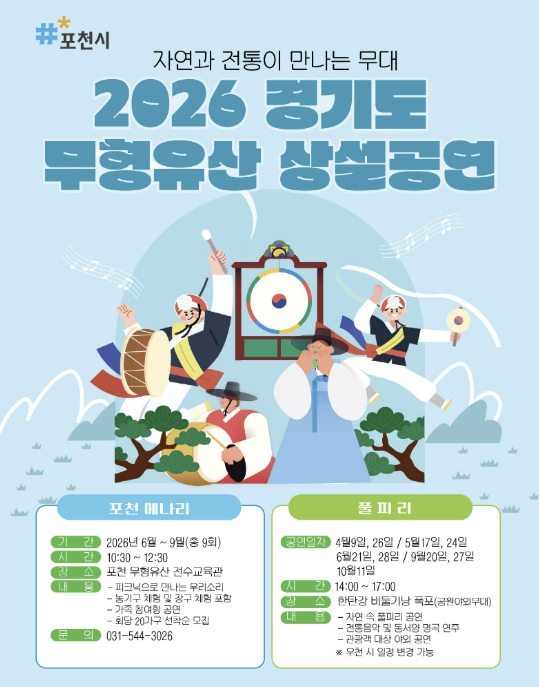 시 관계자는 “이번 상설공연은 포천의 소중한 무형유산이 시민들의 일상 속으로 깊숙이 다가가는 소중한 기회가 될 것”이라며, “앞으로도 우리 시의 유구한 역사와 문화자원을 관광 콘텐츠와 적극 연계하여, 누구나 찾고 싶고 머물고 싶은 ‘품격 있는 인문도시 포천’을 만들어 나가겠다”고 밝혔다.