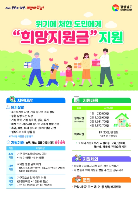 희망지원금은 올해 처음 경남도가 현행 법·제도에서 제외된 저소득 가구 중 위기상황에 처한 가구에 생계비, 의료비 등을 지원받을 수 있도록 도입한 경남형 긴급복지 제도이다.