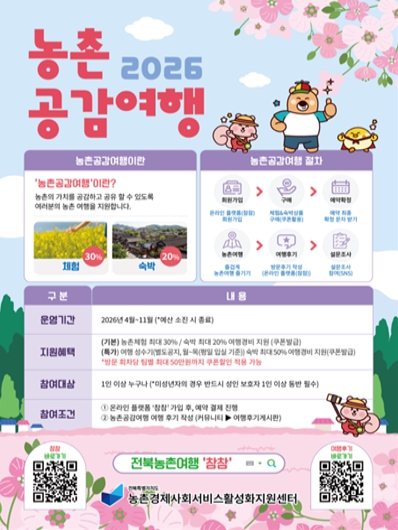 민선식 전북특별자치도 농생명축산산업국장은 “농촌공감여행은 전북 농촌의 고유한 매력을 직접 체험할 수 있는 프로그램”이라며 “도시민에게는 일상 속 쉼을 제공하고, 농촌에는 실질적인 소득으로 이어질 수 있도록 적극 지원하겠다”고 말했다.