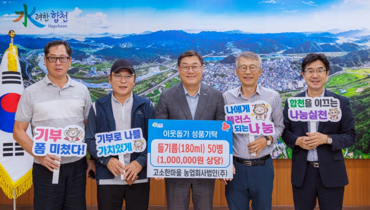 [뉴스앤톡] 고소한마을 농업회사법인(대표 하성목)은 9월 22일 합천군청을 방문해 이웃돕기 성품으로 100만원 상당의 들기름 50병을 합천군에 기탁했다.