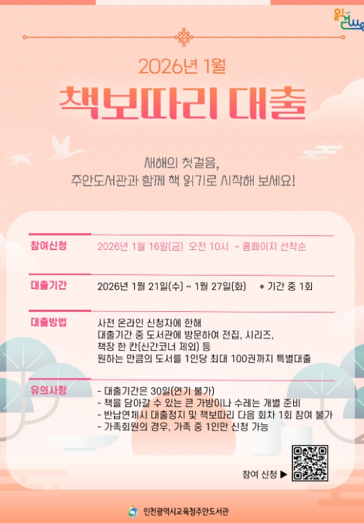 [뉴스앤톡] 인천광역시교육청주안도서관은 지역주민의 독서문화 정착과 대출 활성화를 위하여 2025년에 이어 올해도 '책 보따리 대출'을 실시한다고 14일 밝혔다.