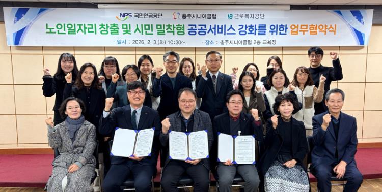 [뉴스앤톡] 충주시니어클럽은 3일 충주시니어클럽 2층 교육장에서 국민연금공단 충주지사, 근로복지공단 충주지사와 함께 ‘노인일자리 창출과 공공서비스 강화를 위한 업무협약(MOU)’을 체결했다.
