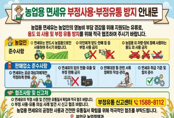 부안군은 농업용 면세유의 투명한 유통 질서를 확립하기 위해 군과 읍면사무소 합동 점검반을 구성하여 관내 면세유 관리기관과 판매업체를 대상으로 현장 점검을 실시하는 한편, 면세유가 목적 외로 사용되거나 불법 유통되지 않도록 현장 지도와 홍보 활동을 병행하고 있다.