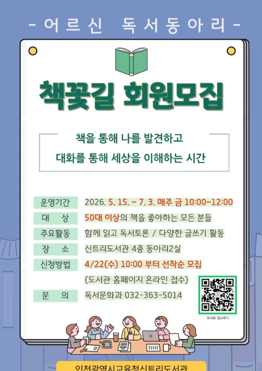 [뉴스앤톡] 인천광역시교육청신트리도서관은 어르신의 정서 안정과 삶의 질 향상을 지원하고 지역사회 독서문화 활성화를 위해 독서동아리 ‘책꽃길’을 운영한다.