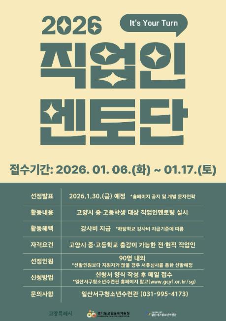 [뉴스앤톡] 고양시청소년재단 일산서구청소년수련관이 청소년들의 진로 탐색·설계를 지원하기 위한 ‘2026 직업인멘토단’을 모집한다고 밝혔다.